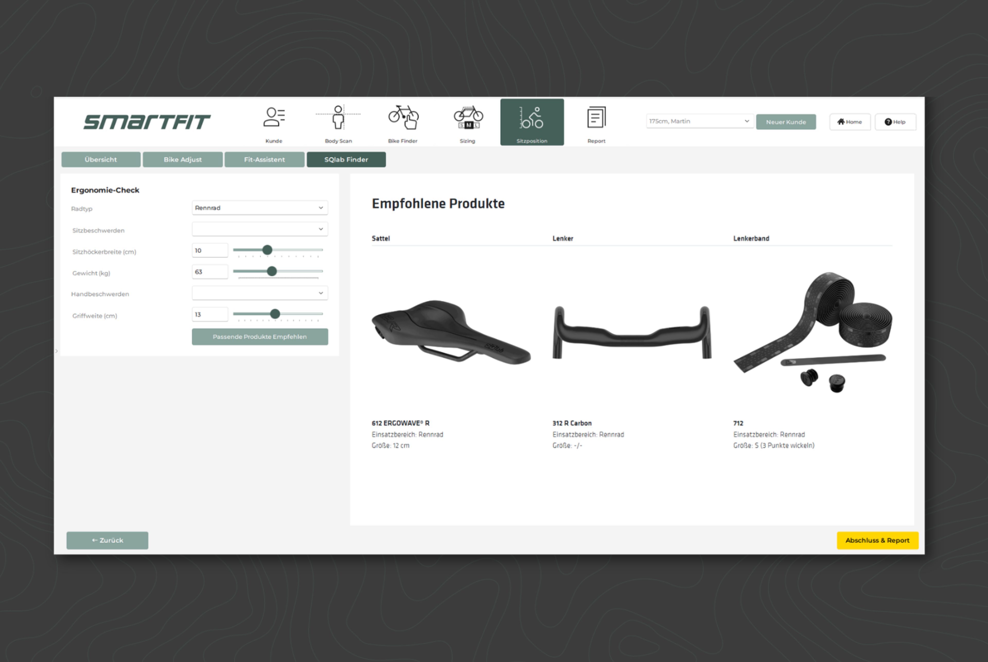 Impress with fast and sales-oriented bike sizing directly in your store. After exact and fast body measurement, you always recommend the correct frame size and seat height with our software. Ideal for use as a mobile event tool.