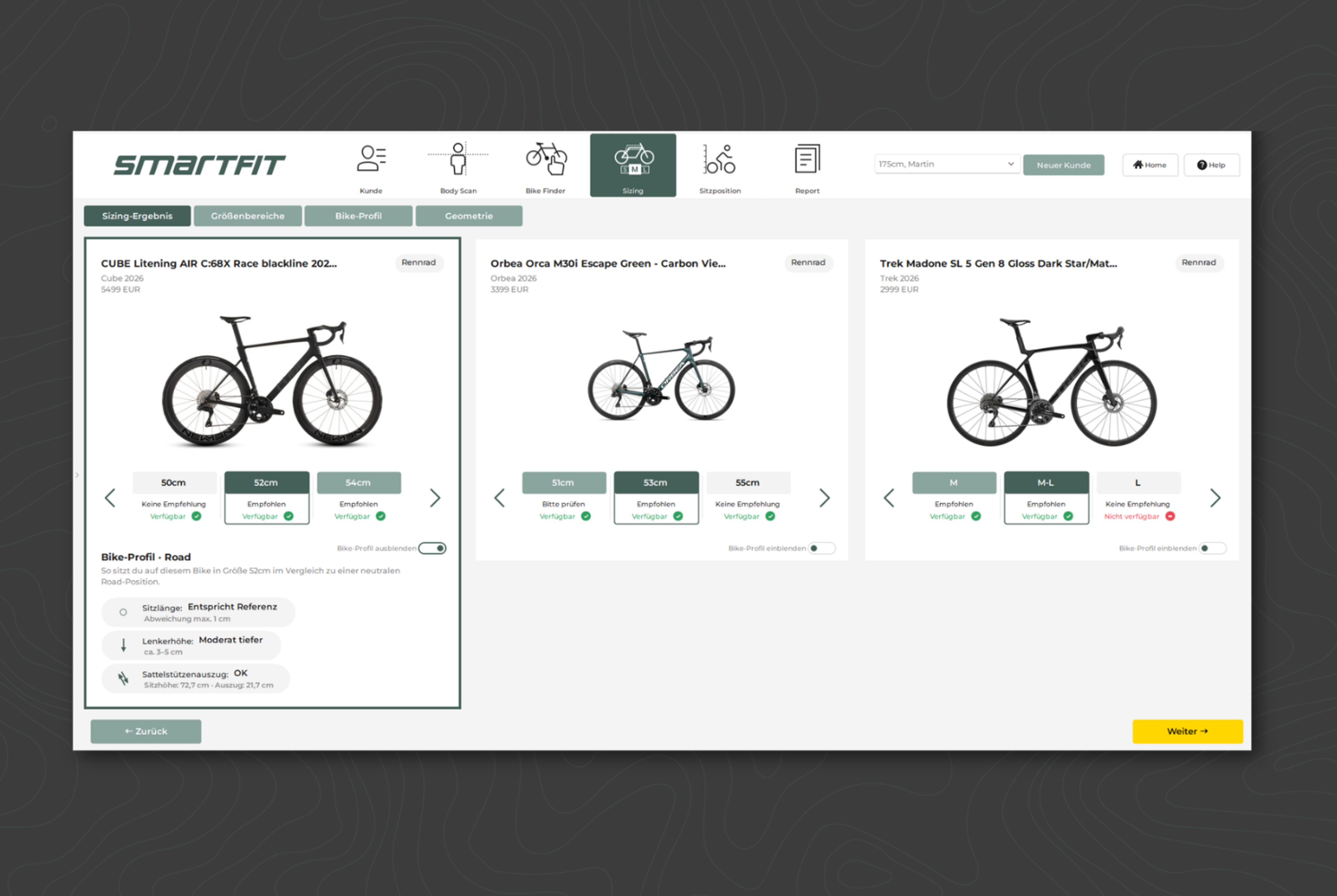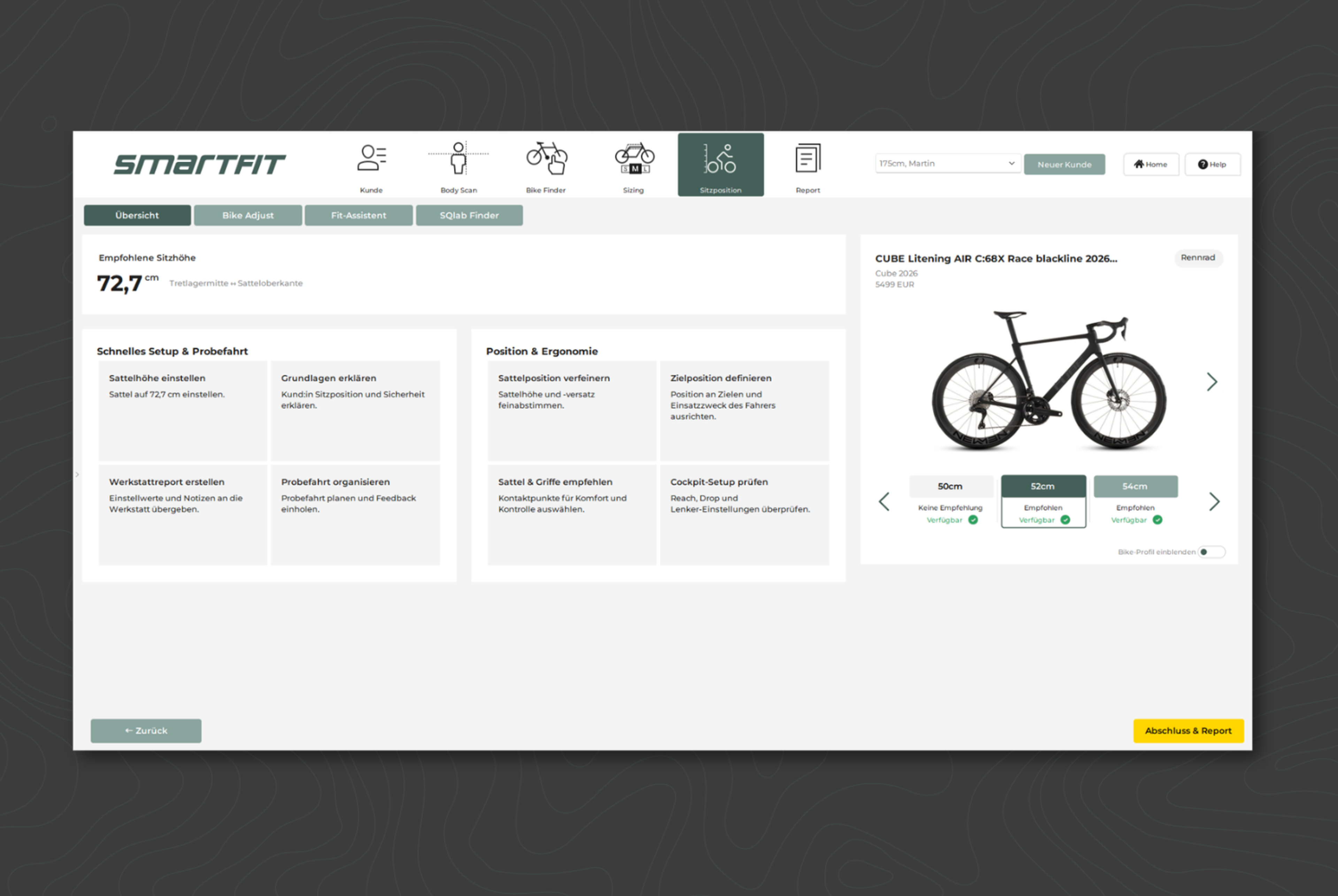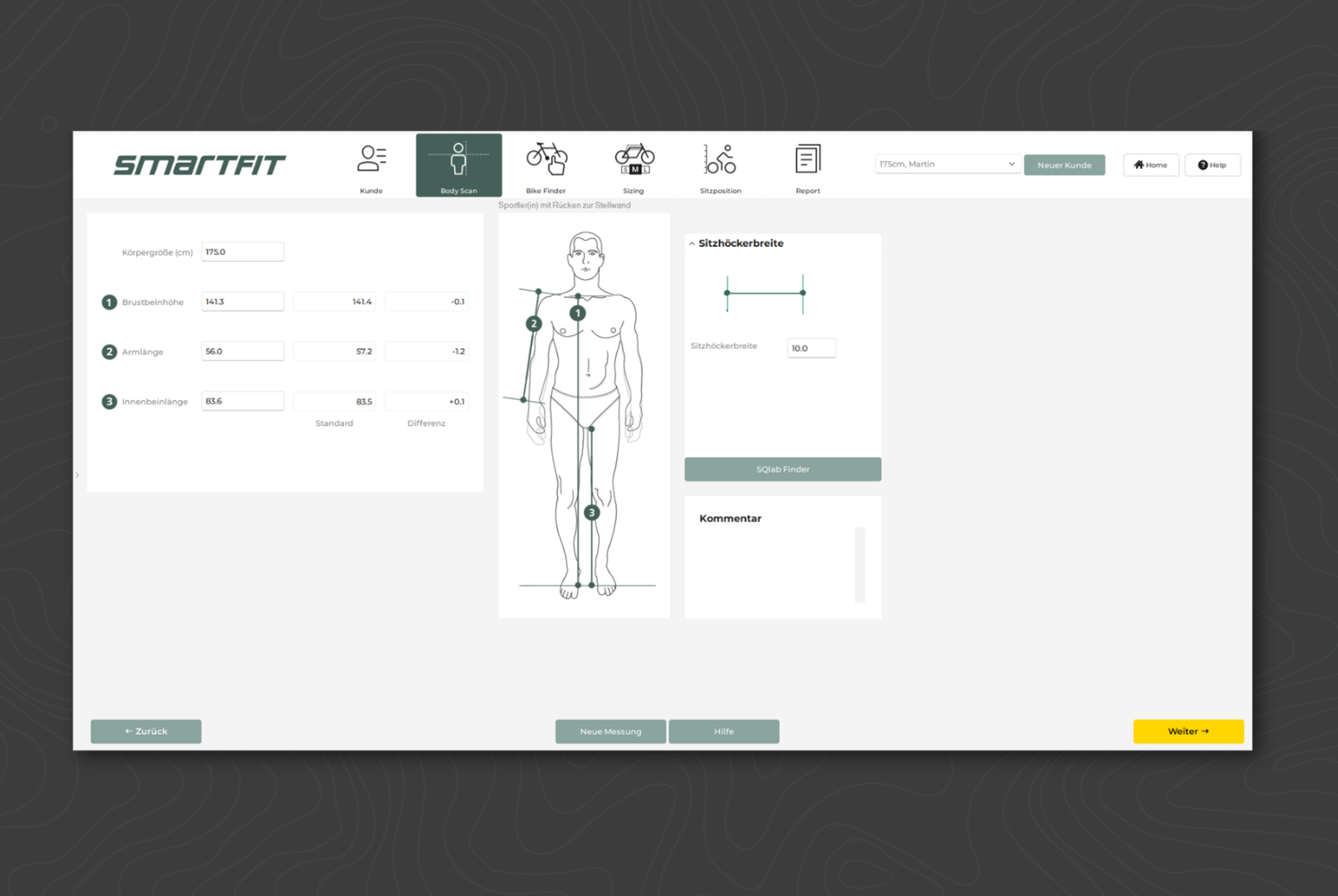 Impress with fast and sales-oriented bike sizing directly in your store. After exact and fast body measurement, you always recommend the correct frame size and seat height with our software. Ideal for use as a mobile event tool.